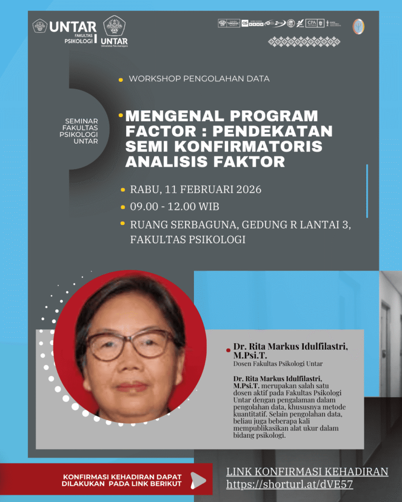 Workshop ini bertujuan untuk menyamakan persepsi terkait pendekatan analisis faktor dan penerapan Structural Equation Modeling (SEM) dalam penelitian psikologi.