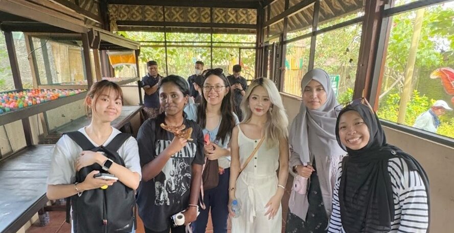 Peserta Immersion Programme sedang melihat proses metamorfosis kupu-kupu di Kemenuh Butterfly Park. Dari kiri ke kanan: Zen (NYP), Sadhana (NYP), Janice (NYP), Ellisa (UNTAR), Hana (UNTAR), Iris (NYP)