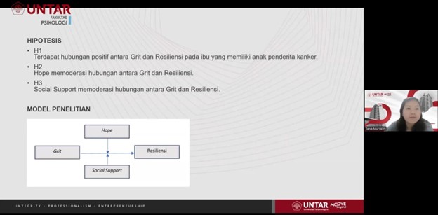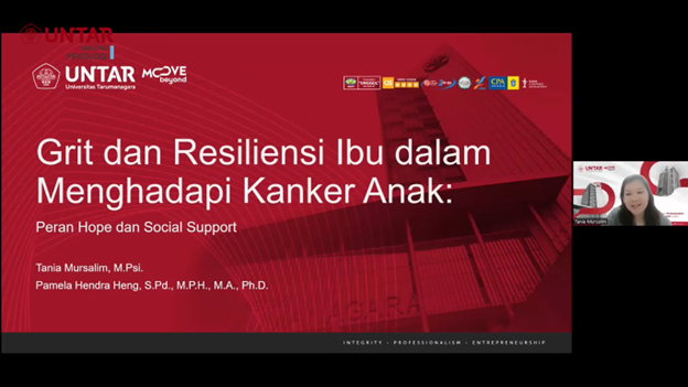 Pada Rabu, 11 Maret 2026 mahasiswa S2 Fakultas Psikologi (F.Psi.) Universitas Tarumanagara (UNTAR) mengikuti kegiatan Forum Diskusi Ilmiah (FDI) yang diselenggarakan secara daring melalui Zoom Meeting pada pukul 16.00–17.30 WIB. Pada kesempatan ini, FDI mengangkat tema “Grit dan Resiliensi Ibu dalam Menghadapi Kanker Anak: Peran Hope dan Social Support.” Diskusi ini menghadirkan Ibu Tania Mursalim, M.Psi. dan Ibu Pamela Hendra Heng, S.Pd., M.P.H., M.A., Ph.D. sebagai narasumber dengan Bapak Dr. Raja Oloan Tumanggor, S.Ag. sebagai moderator untuk memandu jalannya diskusi.
