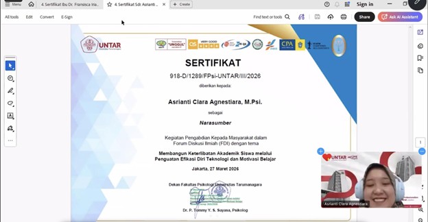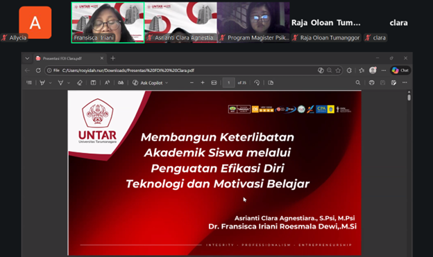 Telah dilaksanakan Forum Diskusi Ilmiah (FDI) dengan mahasiswa S2 Universitas Tarumanagara (UNTAR) sebagai partisipan pada Jumat, 27 April 2026. Kegiatan ini dilaksanakan pada pukul 19.00–21.00 WIB melalui aplikasi Zoom Meeting. FDI kali ini mengusung tema “Membangun Keterlibatan Akademik Siswa Melalui Penguatan Efikasi Diri Teknologi dan Motivasi Belajar” dengan menghadirkan narasumber Ibu Asrianti Clara Agnestiara, S.Psi., M.Psi. dan Ibu Dr. Fransisca Iriani Roesmala Dewi, M.Si.